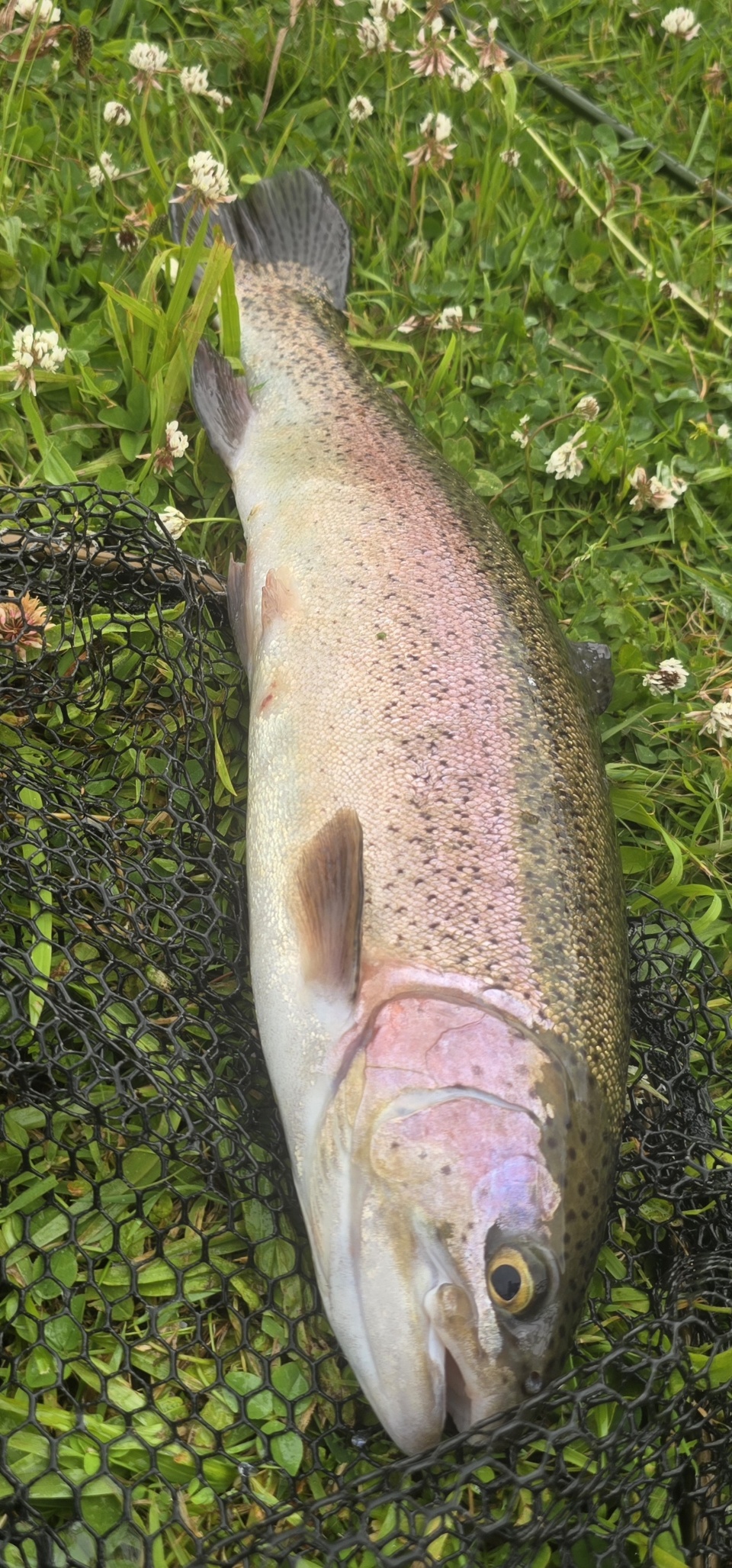Out of curiosity rather than any other reason, I tied on an Elk Hair Caddis and caught a fish within a few casts. Success so soon, as any flyfisher knows, is often the kiss of death. As the hour hand spun, the sun reached its zenith, and after several fly changes, I almost pulled the pin. But I figured I had nothing better to do, so I spent a quiet hour doing a full lap of the lake, without fishing, just watching from under the shade of the many large trees. I saw a lot of trout, but it was the inlet of diverted river water which seemed to be the best prospect. Fish regularly swam in and out of that zone, presumably liking the cooler water. It wasn't the deepest part of the lake by any means, but I fished that 100 metres of bank for another two hours and caught several good fish, including a trifecta of rainbow, blue, and brook trout. I was also taken way down into the backing by a monster I didn't even see, and that knew exactly where the thickest weed-bed was. At least I got my killer fly back: a bead-head green and tinsel damsel.